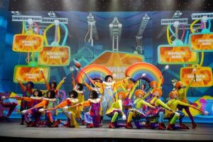 Героями музыкальной сказки с захватывающим сюжетом про волшебное Колесо чудес, из которого появляются мультфильмы, и противную Бабу Ягу, желающую это колесо остановить и заменить все добрые мультики злыми, станут Синий трактор, котенок Котэ, Лунтик и его друзья, находчивые Царевны. В постановке заняты молодые артисты петербургских театров – Театра Музыкальной Комедии, Молодежного театра на Фонтанке, независимых театральных проектов и кукольных театров. Герои постановки поют, показывают акробатические номера и цирковые трюки — танцуют на роликах, жонглируют, демонстрируют элементы эквилибра и так далее. Актерам на сцене помогают артисты в зале, которые вовлекают публику в интерактивное общение — каждые 10 минут действие переходит со сцены в зал! А под личиной вредной, но артистичной Бабы Яги скрывается известный стендапер Алексей Мамонов, резидент комедийных телешоу. Все-таки в шоу для всей семьи без юмора никуда!