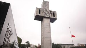 Государственный флаг КНР был приспущен перед участниками мероприятия, включая выживших в резне, местных учащихся и иностранных гостей.